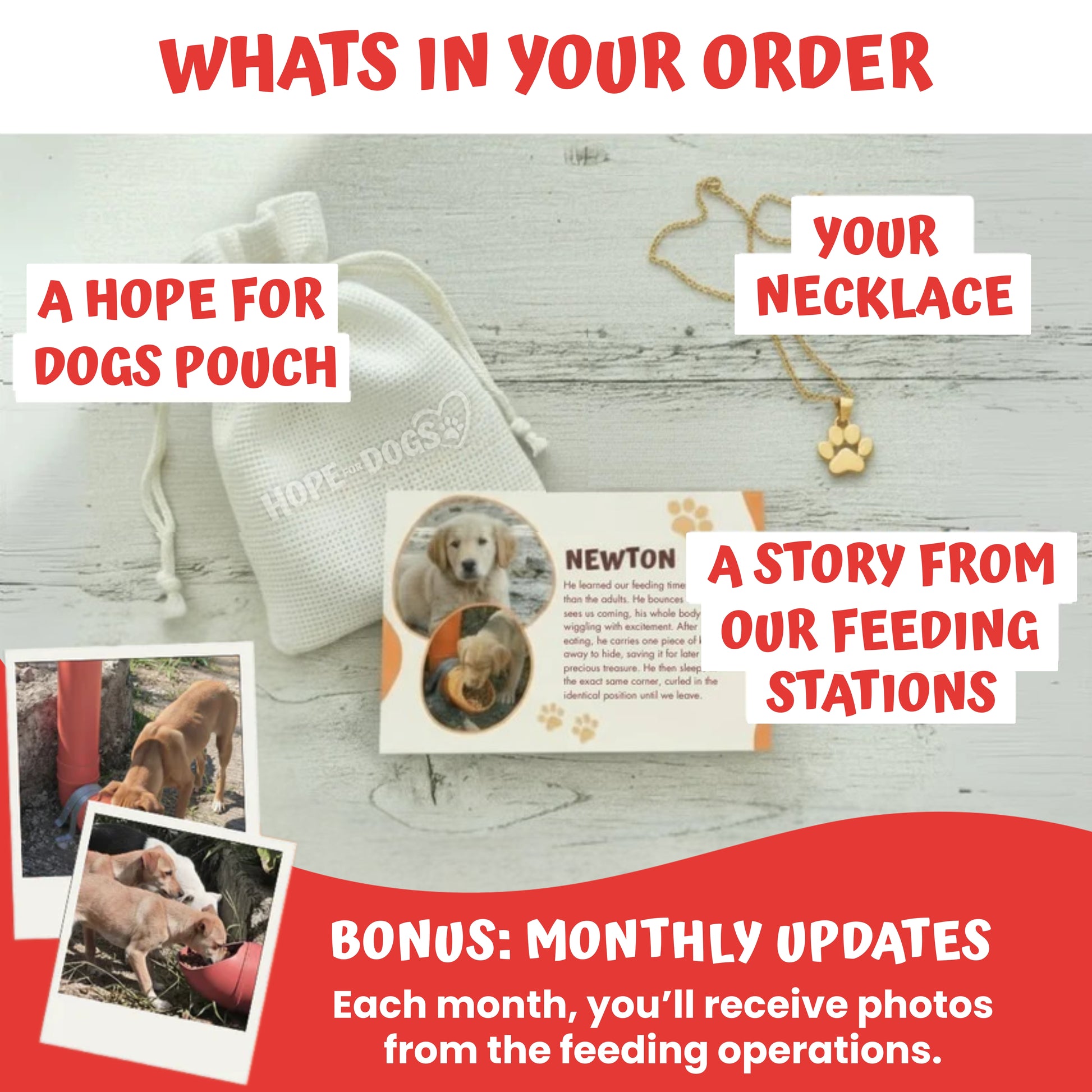 Every item helps us provide 10 meals to abandoned dogs. It's simple. It's real. And it's already working.