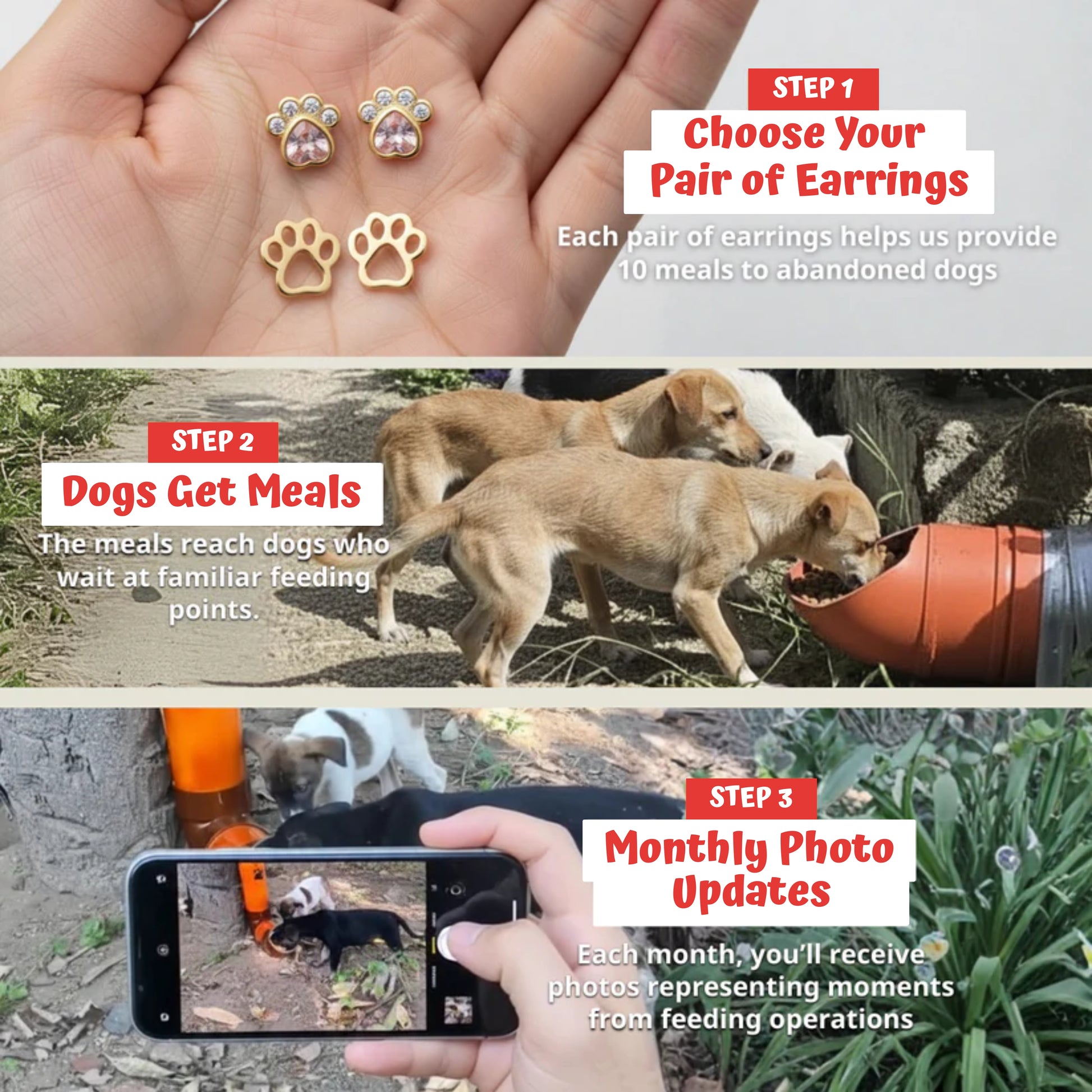 Each pair of earrings helps us provide 10 meals to abandoned dogs.