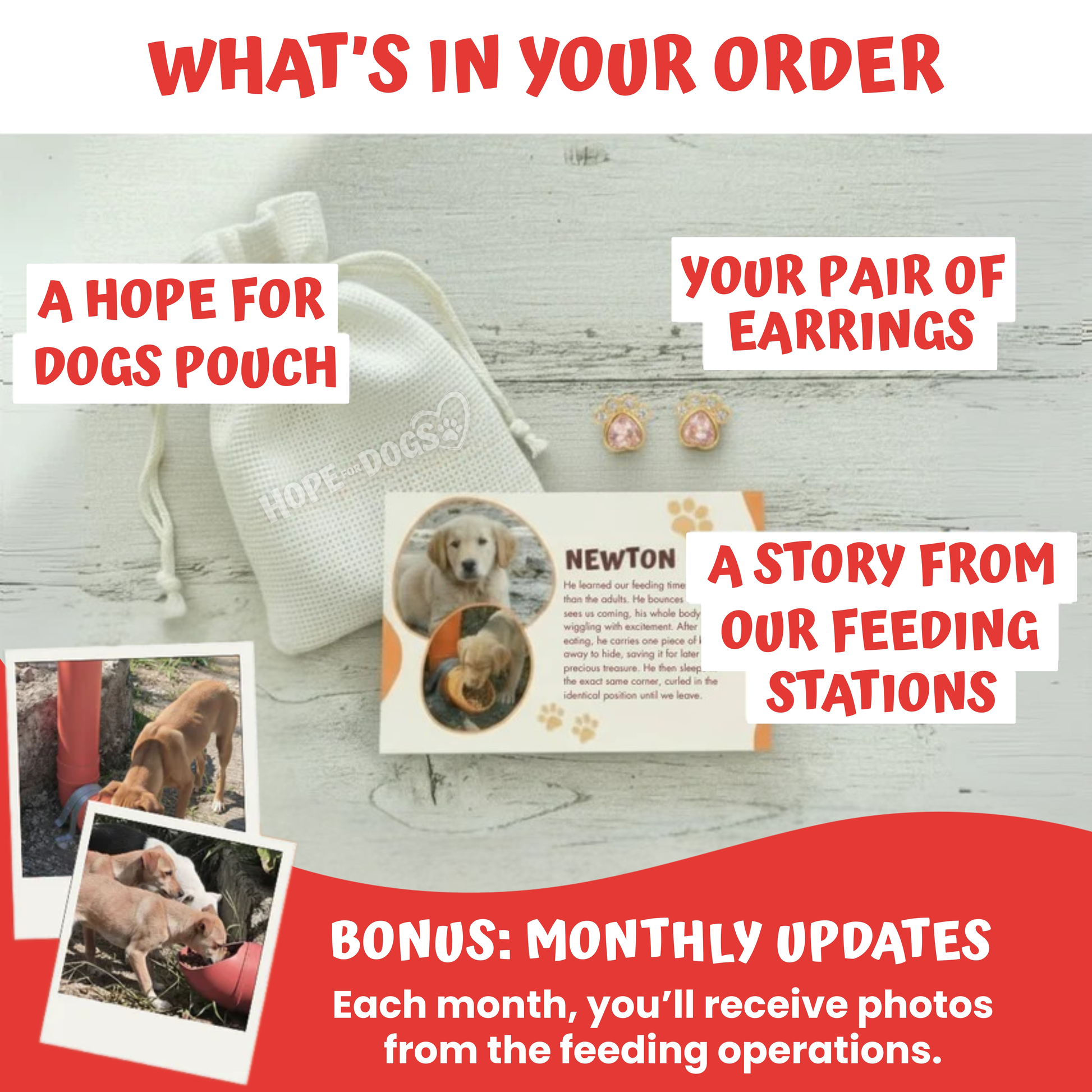 We're a small passionate team with a huge purpose. Every item helps us provide 10 meals to abandoned dogs—and you'll receive your first photos of our work within 30 days